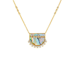 An art deco inspired timeless motif, the eleos necklace features color, sparkle and unmatched craftsmanship. The chain and half-moon display the brilliance and shimmer of hand set white zircon. Carol wears this daily - either as a solo necklace or layered. The baguette cut zircon makes this a decidedly different and unique design.