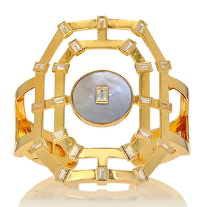 This 1960's inspired hinged cuff features Carol's signature octagonal shape, fiery zircon and open space studded with baguette cut white zircon. Carol loves the contemporary geometric design, round centered gemstone medallion and the bold look of this iconic style. Slip it on and you will never want to take it off.