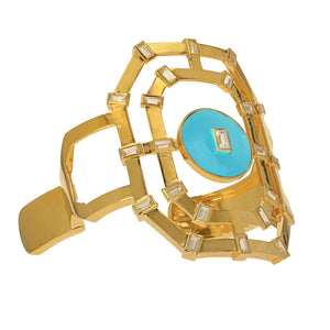 This 1960's inspired hinged cuff features Carol's signature octagonal shape, fiery zircon and open space studded with baguette cut white zircon. Carol loves the contemporary geometric design, round centered gemstone medallion and the bold look of this iconic style. Slip it on and you will never want to take it off.